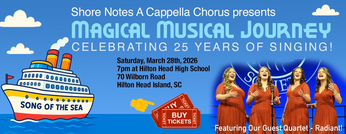 | Description: | The Shore Notes A Cappella Chorus is thrilled to announce we will present our 25th anniversary show, “Magical Musical Journey,” on Saturday, March 28, at 7:00 pm, at Hilton Head High School’s Seahawk Center. This is our first show in five years, so we are very excited about being back on stage to celebrate this momentous occasion! We have also invited a fabulous guest quartet, “Radiant,” who were Rising Star Champions at the 2025 Sweet Adelines International Competition. We would like to thank our presenting sponsors, The Golf Club at Indigo Run and ROC Dental Group, for supporting our efforts in putting on a great show. Tickets are $35 for VIP Preferred Seating, $25 for General Admission, Children 12 and under are free. Tickets are also available from any Shore Notes member, and at Burke's Pharmacy in Hilton Head and Bluffton. ![]() |