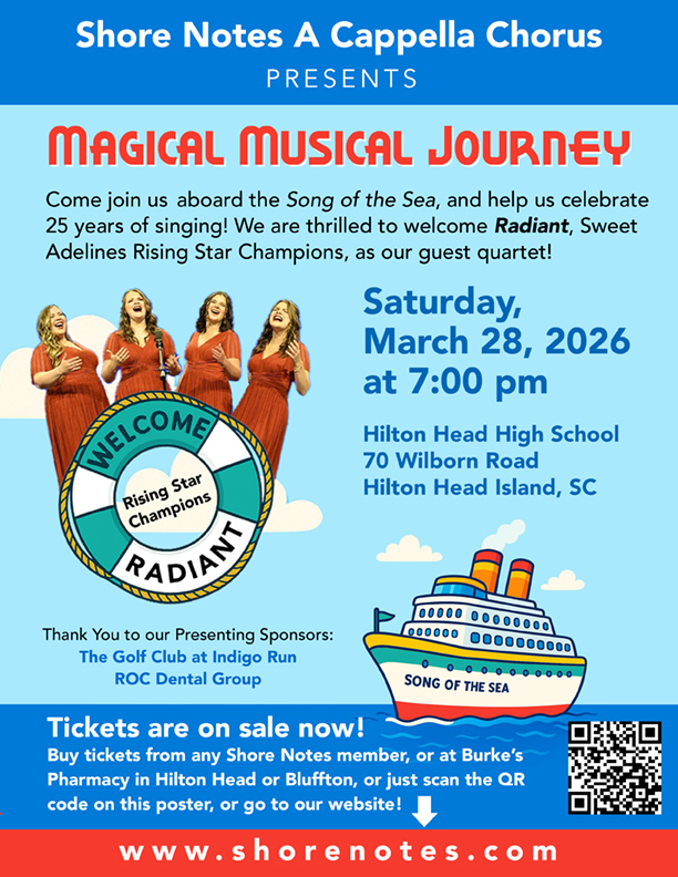 The Shore Notes A Cappella Chorus is thrilled to announce we will present our 25th anniversary show, “Magical Musical Journey,” on Saturday, March 28, at 7:00 pm, at Hilton Head High School’s Seahawk Center. This is our first show in five years, so we are very excited about being back on stage to celebrate this momentous occasion! We have also invited a fabulous guest quartet, “Radiant,” who were Rising Star Champions at the 2025 Sweet Adelines International Competition.